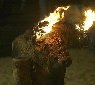トロジュビロ祭では、まず雄牛の角に、タールを染込ませた2つのたいまつがくくりつけられ、火をつけられます。